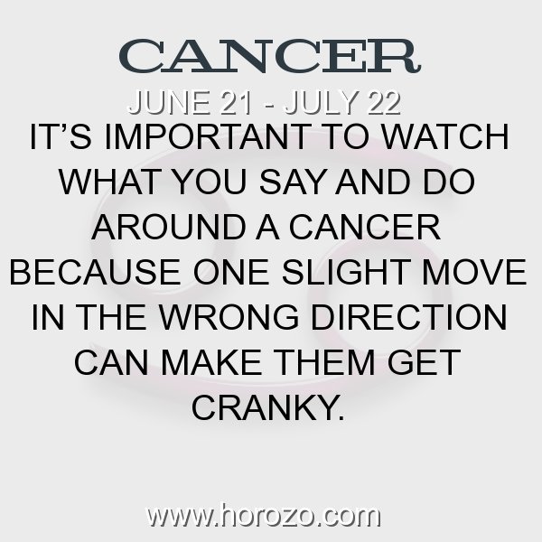 Cancer is the zodiac sign of those individuals who are born on june 21 up to july 22. They are tenacious, highly imaginative, loyal, emotional, sympathetic, persuasive but moody, pessimistic, suspicious, manipulative, insecure. Cancer is the second of the four cardinal signs of the zodiac, who all hold elemental energy of initiation and leadership at the beginning of the four seasons. They say the word 'i' more than any other zodiac sign, everything is about them. Cancers are overly sensitive and cannot fight their own battles.